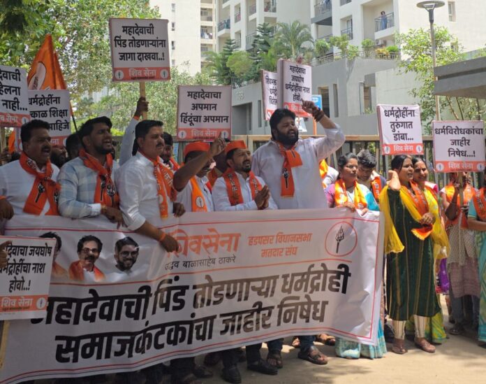 यावेळी सोसायटीतील रहिवासी, स्थानिक नागरिक, शिवभक्त व शिवसैनिक आंदोलनात सहभागी झाले होते. समाजकंटक आरोपींवर गुन्हे दाखल करून लवकरात लवकर अटक करा आणि कठोर कारवाई करावी अशी मागणी शिवसेनेच्या वतीने व रहिवाशांच्या वतीने या ठिकाणी करण्यात आली.