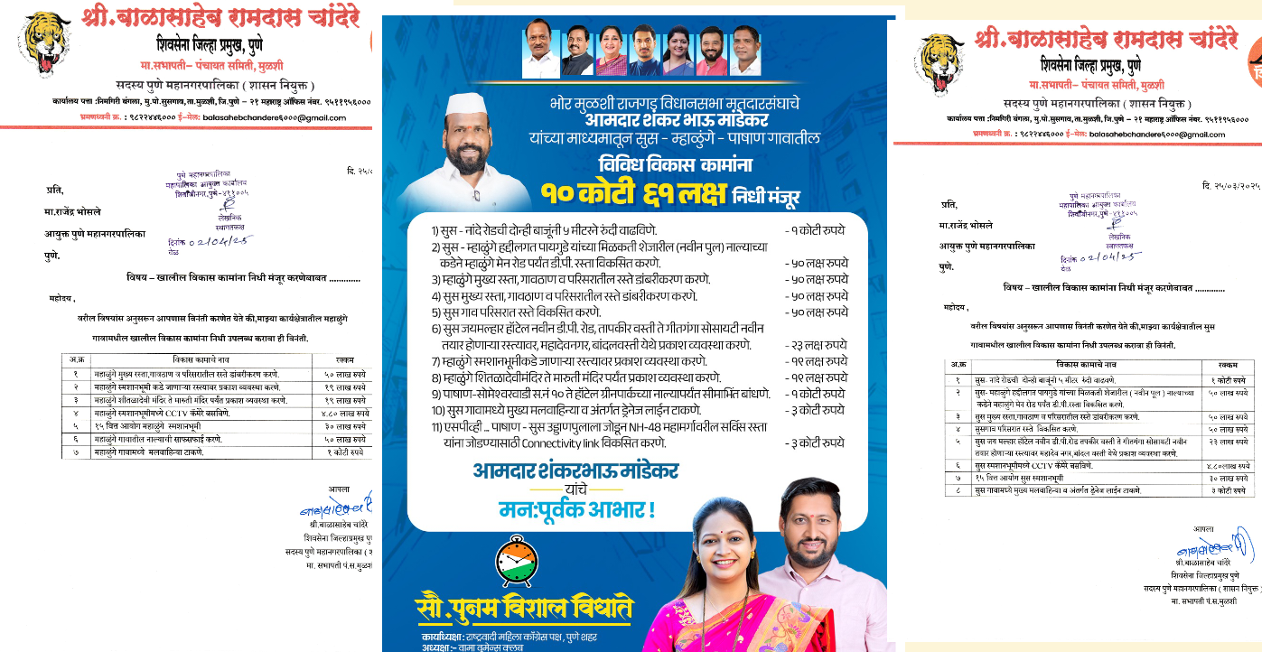 यानुसार निधी उपलब्ध झाल्यानंतर राष्ट्रवादी काँग्रेस अजित पवार गटाच्या इच्छुक उमेदवारांकडून आमदार शंकर मांडेकर यांच्या माध्यमातून निधी उपलब्ध झाल्याची जाहिरात करत श्रेय राष्ट्रवादीकडे वळवण्याचा प्रयत्न करण्यात आला आहे.