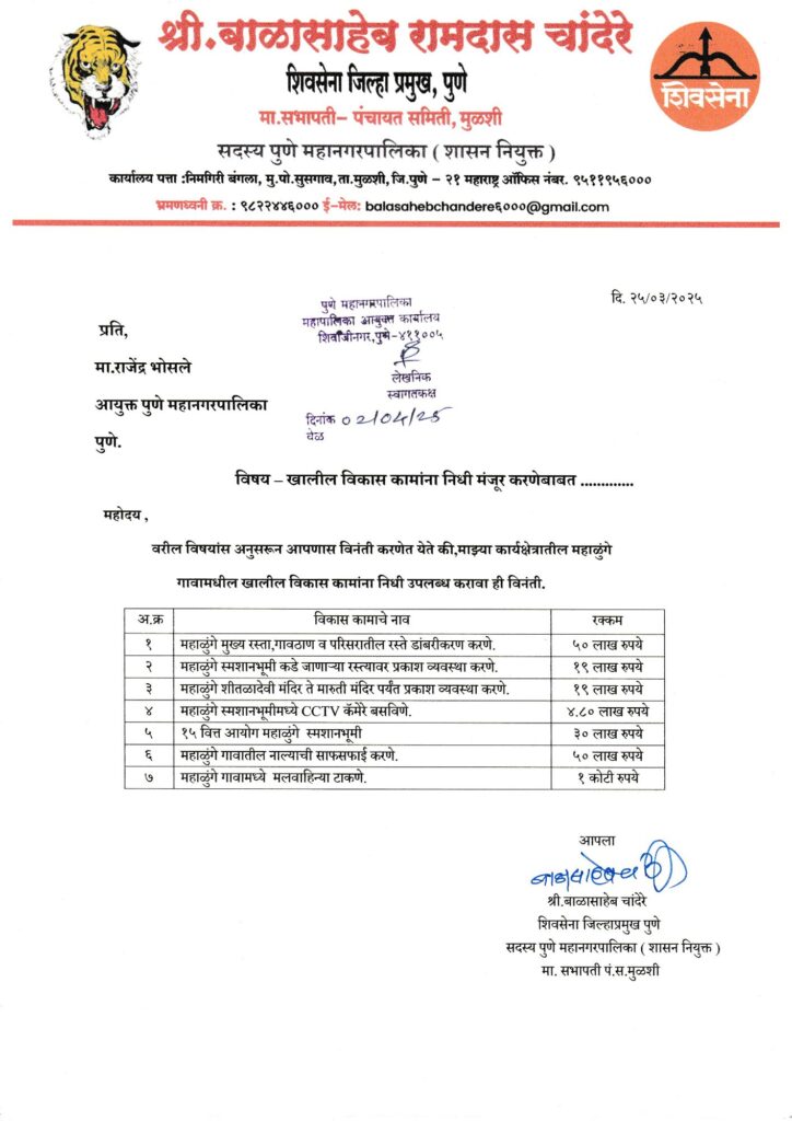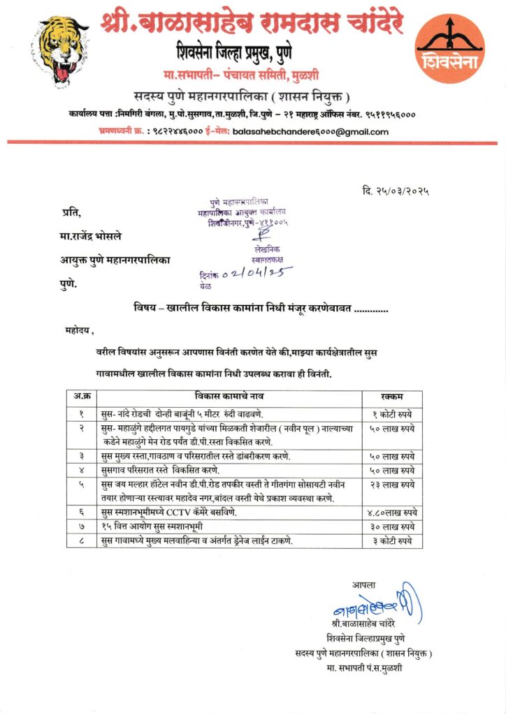 एप्रिल महिन्यामध्ये पुणे महानगरपालिकेचे शासन नियुक्त सदस्य शिवसेना जिल्हाप्रमुख बाळासाहेब चांदरे यांच्या माध्यमातून सुस नांदे रोडची दोन्ही बाजूने पाच मीटर रुंदी वाढवणे, सुस महाळुंगे पायगुडे यांच्या हद्दीलगत डीपी रस्ता विकसित करणे, सुसगाव गावठाण परिसरातील रस्ते विकसित करणे, सुसगाव परिसरातील रस्ते विकसित करणे, सुसगाव स्मशानभूमी परिसरात सीसीटीव्ही कॅमेरे बसवणे, तापकीर वस्ती, महादेव नगर बांदल वस्ती परिसरात प्रकाश व्यवस्था करणे, सुसगाव परिसरात मुख्य मलनिस्सारण वाहिनी विकसित करणे, महाळुंगे मुख्य रस्ता गावठाण परिसरातील रस्ते डांबरीकरण करणे, महाळुंगे शितळादेवी मंदिर रस्ता व स्मशानभूमी रस्ता प्रकाशयोजना करणे, महाळुंगे परिसरामध्ये ड्रेनेज लाईन विकसित करणे, स्मशानभूमी परिसरात सीसीटीव्ही बसवणे, सुस व महाळुंगे स्मशानभूमी कामांसाठी निधी आदी कामे बाळासाहेब चांदेरे यांच्या माध्यमातून बजेटमध्ये निधीसह सुचवण्यात आली होती.