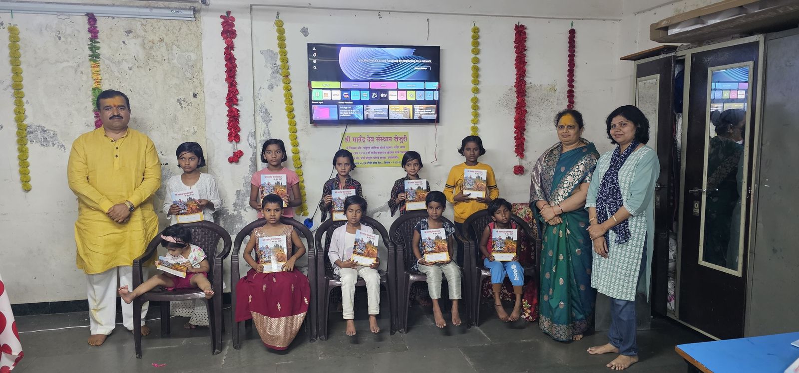 पुणे : श्री मार्तंड देव संस्थान, जेजुरी न्यासाच्या ॲड.पांडुरंग ज्योतिबा थोरवे यांच्या मंदिर न्यास निधीतून पुणे महानगरपालिका संचलित बचपन बचाव समिती अंतर्गत घरट प्रकल्प या अनाथ मुलींच्या आश्रमाला नवरात्रीचे औचित्य साधून 55 इंची टीव्ही संच भेट देण्यात आला.