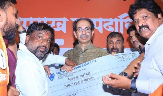 कोथरूड : पुणे येथे कार्यकर्ता मेळाव्यात शिवसेना उद्धव बाळासाहेब ठाकरे पक्षाचे शिवसैनिक जयदीप पडवळ यांनी मराठवाड्यातील पूरग्रस्त नागरिकांच्या मदतीसाठी शिवसेनाप्रमुख उद्धव ठाकरे यांच्याकडे 51 हजार रुपये मदतीचा चेक सुपूर्द केला.