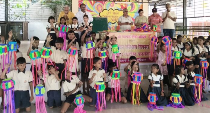 महाळुंगे: वस्ती विभागातील म.न.पा. शाळा महाळूंगे येथे जीवन कौशल्य विकास व भगवती सेवा आश्रम यांच्या संयुक्त विद्यमाने आकाश कंदिल निर्मिती कार्यशाळा आयोजित करण्यात आली होती.