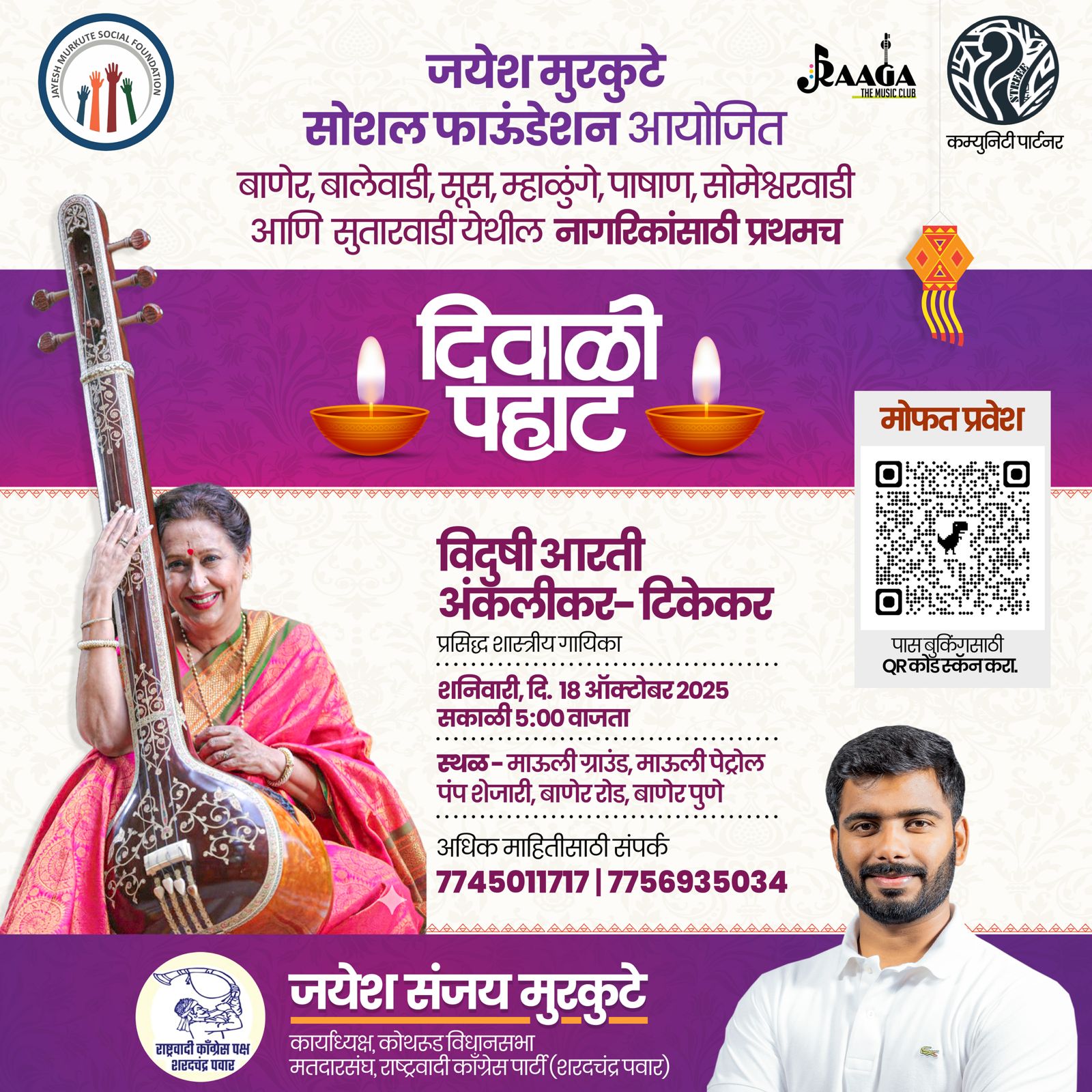 बाणेर : बाणेर येथे जयेश मुरकुटे सोशल फाउंडेशनतर्फे दिवाळी पहाट प्रख्यात शास्त्रीय गायिका विदुषी आरती अंकलीकर-टिकेकर यांच्या गायनाच्या कार्यक्रमाचे आयोजन करण्यात आले आहे.