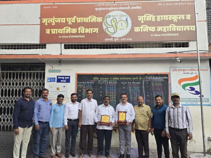 सांगवी : मृत्युंजय एज्युकेशन सोसायटीचे नृसिंह हायस्कुल व कनिष्ठ महाविद्यालय, सांगवी येथे कार्यरत प्राचार्य अशोक दिनकर संकपाळ सर हे  सेवानिवृत्त झाले. त्यांच्या सेवापुर्ती निमित्त त्यांना सन्मानचिन्ह देवुन त्यांच्या कार्याचा गौरव करण्यात आला.