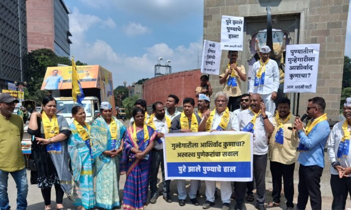 पुणे : कधीकाळी सांस्कृतिक शहर म्हणून ओळख असलेल्या पुण्यामध्ये सातत्याने मारामारी, गँगवार, खंडणी छेडछाड अशा पद्धतीचे गुन्हे घडत आहेत आणि अनेक कुविख्यात गुंडांना राजकीय आश्रय असल्याचे समोर येते आहे. या पार्श्वभूमीवर आम आदमी पार्टी तर्फे आज शिवाजीनगर मेट्रो स्टेशन जवळ तीव्र निदर्शने करण्यात आली व सरकारला प्रश्न विचारण्यात आले. मारणे, घायवळ, आंदेकर, मोहोळ आदी टोळ्यांची नावे पुढे येत असून यांना सहाय्य केल्याच्या आरोप, प्रत्यारोप काही आजी माजी आमदार करीत आहेत.
