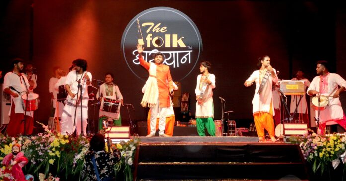 लोककलांचे पारंपरिक प्रकार द फोक आख्यानातून एकापाठोपाठ सादर होत गेले. रिवाजानुसार गणोबाला वंदन करून कलाकारांनी नऊ रात्रींच्या देवीच्या आख्यानाचा मंडप बांधला. नवखंड पृथ्वीचा खेळ मांडलेल्या कृष्णाचा शोध लौलिक पातळीवर घेणाऱ्यांना कोपरखळी मारत, धरतीची घोंगडी आणि आकाशाचा मंडप सजवलेल्या ठिकाणी मराठी मुलुखातून देवीचा छबिना, पलंगकथांच्या माळा गुंफत उत्तरोत्तर रंगत गेला. कलाकारांनी कमावलेले आवाज, पेहराव, रंगसंगती, वाद्याचे वैविध्य आणि वादकांचे कौशल्य यामध्ये रसिक रंगून गेले आणि ‘द फोक आख्याना’च्या सादरीकरणाला कोथरूडकरांनी भरभरून दाद दिली.