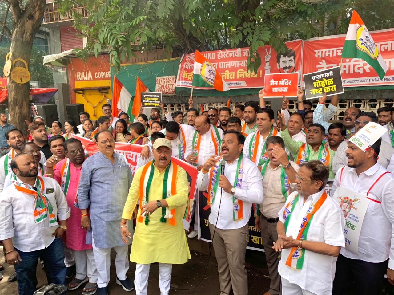 सदर प्रसंगी पुणे शहर जिल्हा काँग्रेस कमिटीचे अध्यक्ष अरविंद शिंदे हे आपल्या भाषणात म्हणाले की, पुणे शहरातील जैन मंदिर व बोर्डींग हाऊसची कोट्यावधी रूपयांची जागा कवडीमोल भावाने दादागिरी करून ताब्यात घेऊन एक दिवसात सर्व परवानग्या घेण्यात आल्या. या कोट्यावधी रूपयांच्या जागेत कोटींचा भ्रष्टाचार करणाऱ्या केंद्रीय मंत्र्यांचा ताबडतोब राजीनामा घ्यावा व जैन समाजाला न्याय द्यावा. तसेच मुरली मोहोळ यांनी पुणे शहरामध्ये केलेले अनेक जमिन घोटाळे यांची सुध्दा चौकशी करण्यात यावी. अशा या घोटाळेबाज मंत्र्याला मुख्यमंत्री महोदय पाठिशी घालण्याचे काम करीत आहे याचा अर्थ त्यांचा सुध्दा सहभाग या घोटाळ्यामध्ये दिसत आहे.’’