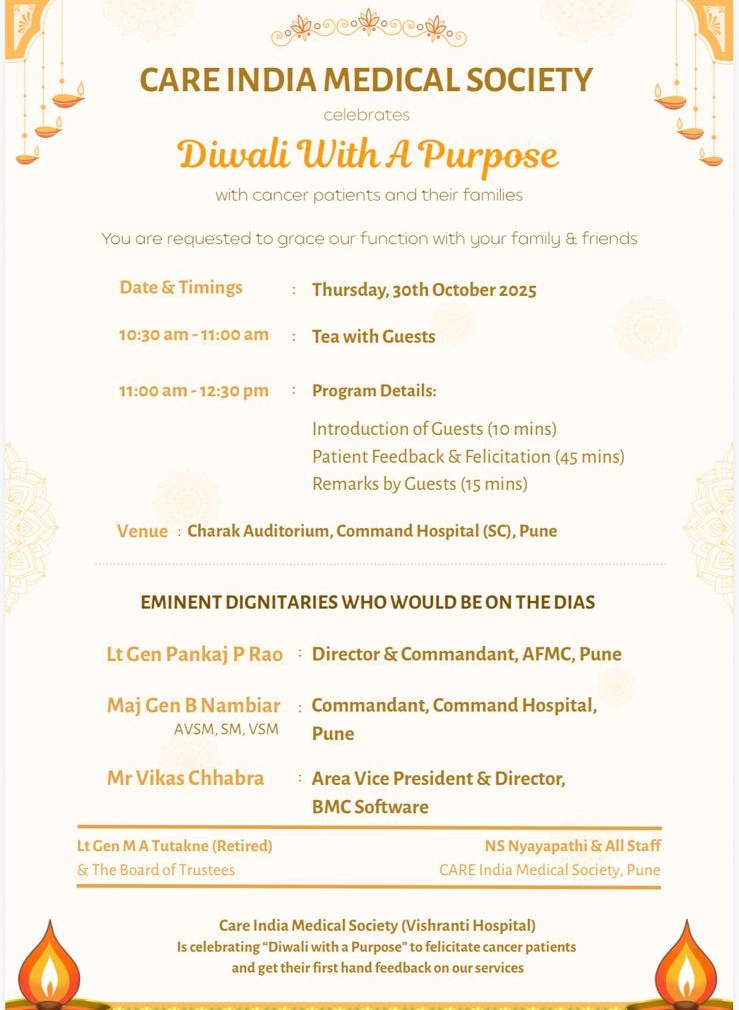 केअर इंडिया मेडिकल सोसायटी दरवर्षी या उपक्रमाच्या माध्यमातून रुग्णांना प्रोत्साहन देत समाजात सकारात्मकता आणि संवेदनशीलतेचा संदेश पोहोचवते. ‘दिवाळी विथ अ पर्पज’ हा यावर्षीचा स्नेहसोहळा नेहमीप्रमाणेच रुग्णांच्या चेहऱ्यावर आशेचा आणि आनंदाचा प्रकाश फुलविणारा ठरेल असा विश्वास डॉ. डॉ. एन. एस. न्यायापथी यांनी व्यक्त केला.