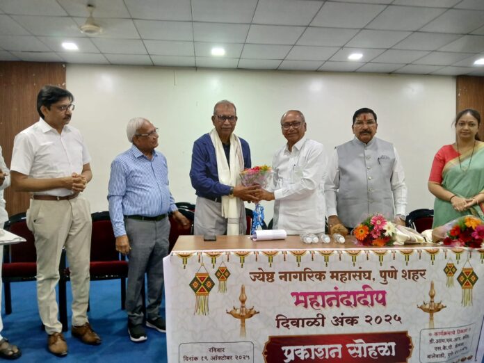 बाणेर : ज्येष्ठ नागरिक महासंघ, पुणे शहर या संस्थेचा महानंदादीप या दिवाळी अंकाचा प्रकाशन सोहळा बालेवाडी येथील श्री खंडेराय प्रतिष्ठान संस्थेतील सभागृहात श्री. अशोकराव मुरकुटे, अध्यक्ष, अभिनव शिक्षण प्रसारक मंडळ, औंध यांच्या हस्ते संपन्न झाला.