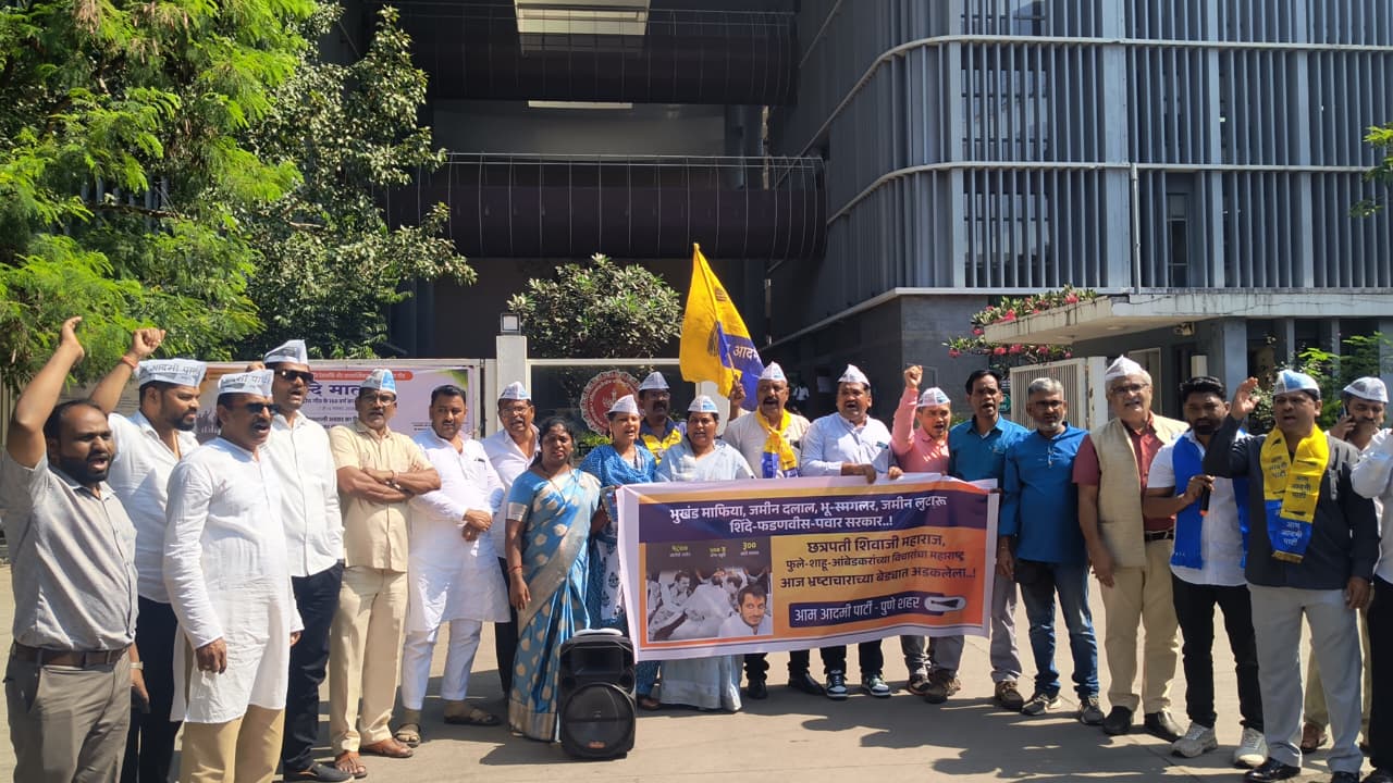 पुणे : पुण्यात दिवसेंदिवस महायुती सरकारच्या घटक पक्षांकडून होत असलेल्या जमीन घोटाळ्यांबाबत नागरिकांमध्ये तीव्र नाराजी असून, पुणे शहरातील जमीन घोटाळ्यांच्या विरोधात आम आदमी पार्टीच्या वतीने जिल्हाधिकारी कार्यालय समोर आज आंदोलन करण्यात आले.