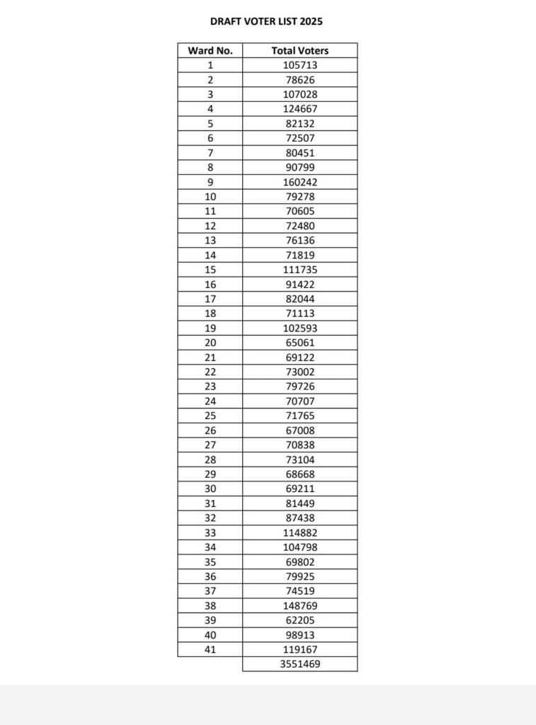 त्यानुसार 41 प्रभागांमध्ये एकूण मतदार 35 लाख 51 हजार 469 आहेत.प्रारूप मतदार यादीवर दिनांक नोव्हेंबर 20 नोव्हेंबर 2025 ते दिनांक 27 नोव्हेंबर 2025 या कालावधीमध्ये हरकती व सूचना दाखल करून घेण्यात येणार आहेत.