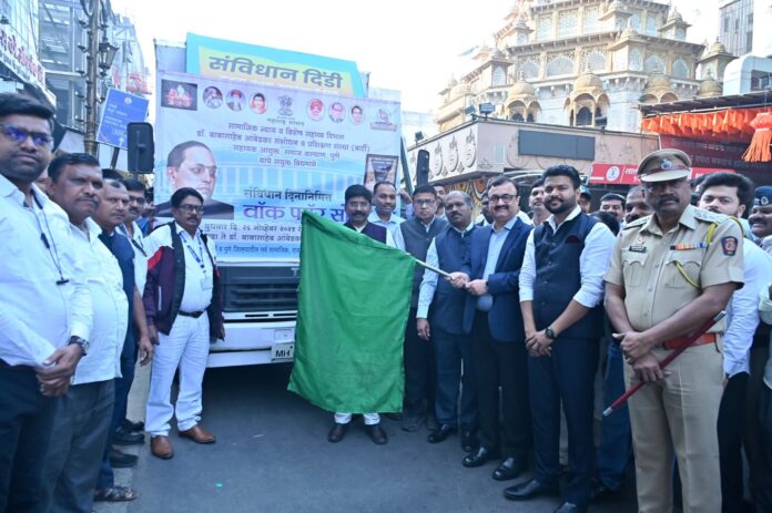 पुणे : डॉ. बाबासाहेब आंबेडकर संशोधन व प्रशिक्षण संस्था (बार्टी) आणि सहायक आयुक्त समाजकल्याण, पुण्यातील संविधान प्रेमी नागरिक यांच्या संयुक्त विद्यमाने संविधान दिनानिमित्त ‘वॉक फॉर संविधान’ रॅली आयोजित करण्यात आली. या रॅलीचे उद्घाटन विभागीय आयुक्त डॉ. चंद्रकांत पुलकुंडवार यांच्या हस्ते करण्यात आले.