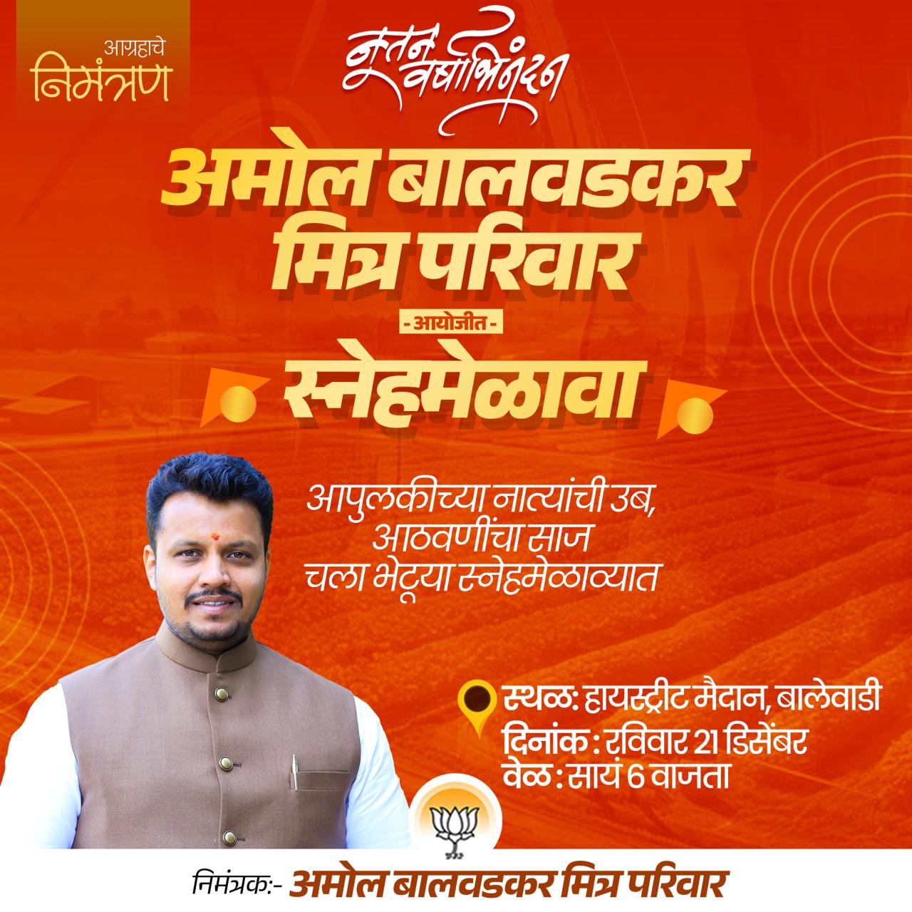 बालेवाडी : अमोल बालवडकर मित्र परिवाराच्यावतीने येत्या रविवारी 21 डिसेंबर रोजी सायंकाळी 6 वाजता शहरातील हायस्ट्रीट मैदान येथे भव्य स्नेहमेळाव्याचे आयोजन करण्यात आले आहे. मित्रपरिवार, कार्यकर्ते, हितचिंतक तसेच नागरिकांना एकत्र आणून आपुलकीचे आणि विश्वासाचे नाते अधिक दृढ करण्याच्या उद्देशाने हा कार्यक्रम आयोजित करण्यात आला आहे.