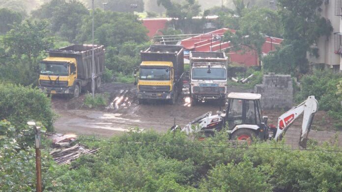 विशेष बाब म्हणजे, NA कलेक्टर अमेनिटी व ओपन स्पेस मंजूर असतानाही, काही राजकीय व्यक्तींच्या आशीर्वादाने बाहेरून २ JCB आणि १२ डंपर साईरंग गार्डन सोसायटीच्या अंतर्गत रस्त्यावर बेकायदेशीरपणे पार्क करण्यात आले आहेत. यामुळे सोसायटीतील सुमारे १५० कुटुंबांच्या सुरक्षिततेचा गंभीर प्रश्न निर्माण झाला आहे.