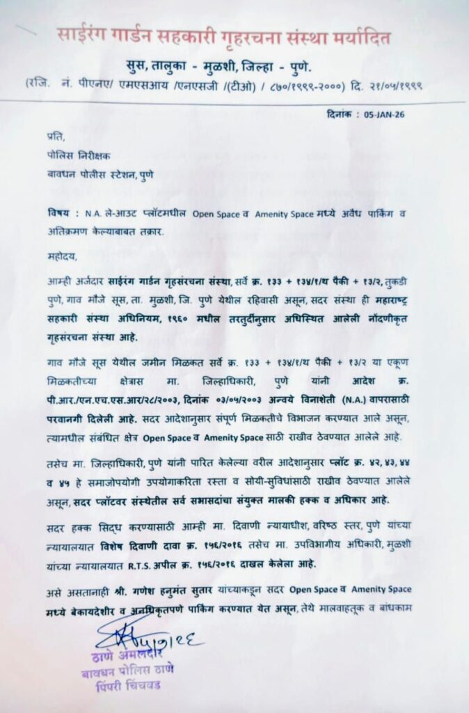 या संपूर्ण प्रकरणासंदर्भात साईरंग गार्डन सोसायटीच्या नागरिकांनी आज दिनांक ०५ जानेवारी २०२६ रोजी बावधन पोलीस स्टेशन येथे पोलीस निरीक्षक अनिल विभुते यांच्याकडे लेखी तक्रार दाखल केली आहे. तक्रारीत बेकायदेशीर पार्किंग तात्काळ हटवून दोषींवर कारवाई करण्याची मागणी करण्यात आली आहे.