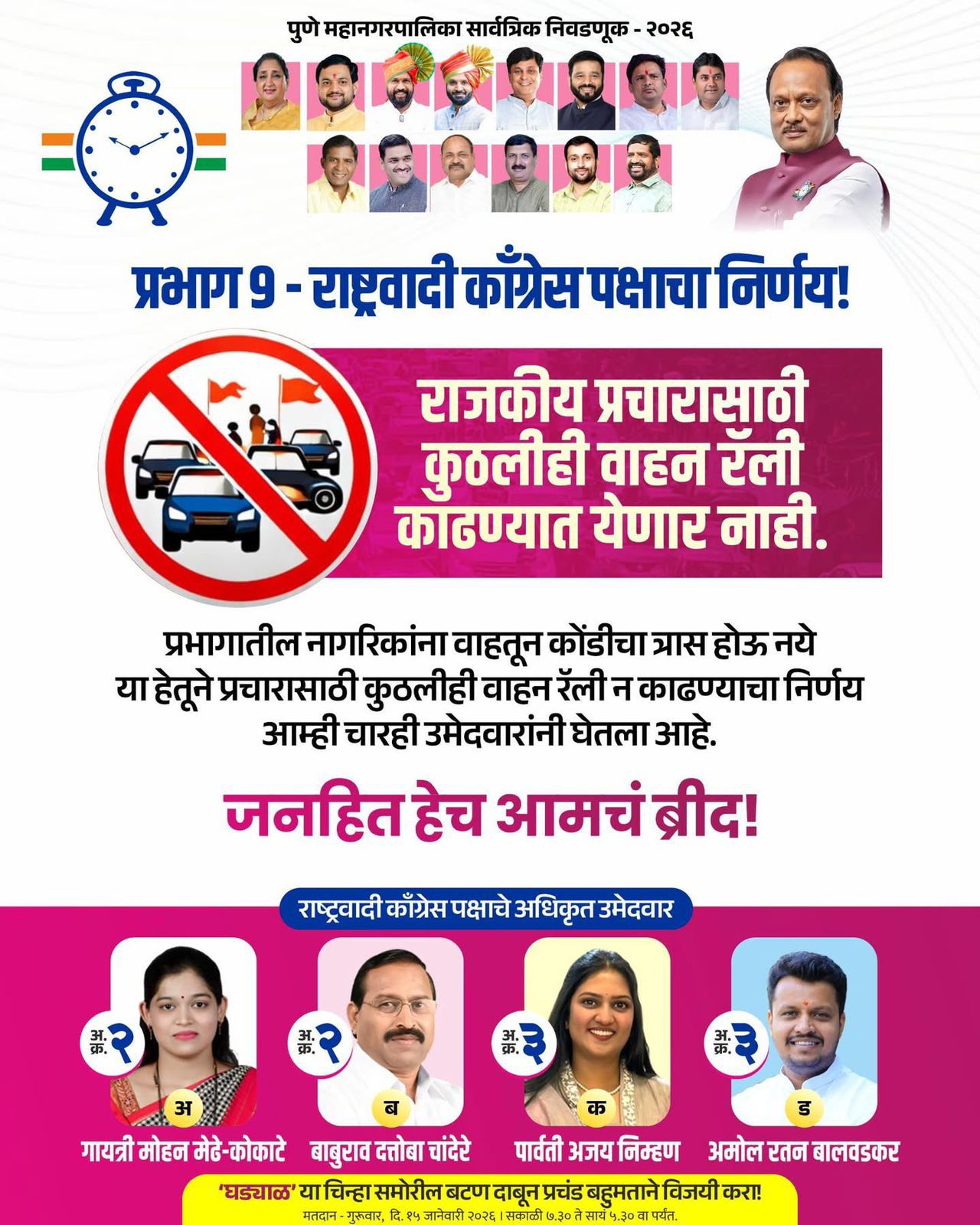 पुणे | प्रतिनिधी : पुणे महानगरपालिका सार्वत्रिक निवडणूक २०२६ च्या पार्श्वभूमीवर प्रभाग क्रमांक ९ (बाणेर, बालेवाडी, पाषाण, सुतारवाडी, सोमेश्वरवाडी, सुस, महाळुंगे) मध्ये राष्ट्रवादी काँग्रेस पक्षाने एक महत्त्वपूर्ण आणि लोकाभिमुख निर्णय घेतला आहे. प्रभागातील नागरिकांना वाहतूक कोंडी व त्रास होऊ नये, यासाठी निवडणूक प्रचारादरम्यान कोणतीही वाहन रॅली न काढण्याचा निर्णय राष्ट्रवादी काँग्रेसच्या चारही अधिकृत उमेदवारांनी एकमताने घेतला आहे.