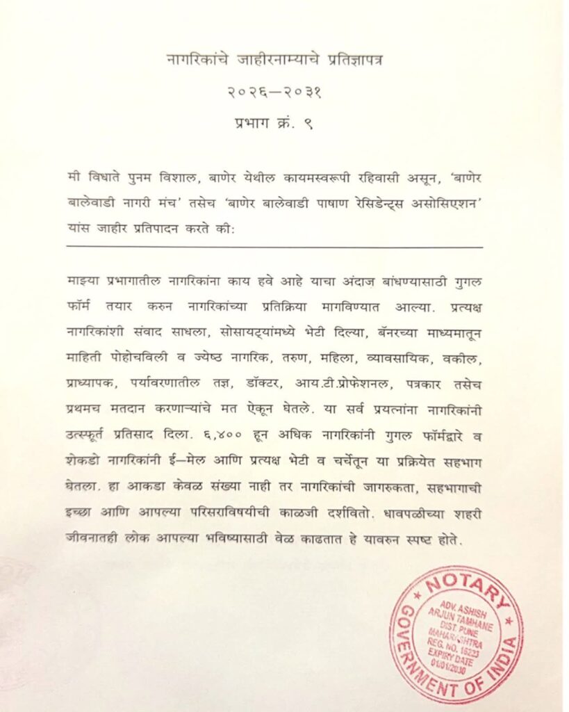 पुणे | प्रतिनिधी : प्रभाग क्रमांक ९ (बाणेर–बालेवाडी–पाषाण) येथील नागरिकांच्या समस्या, अडचणी व मागण्यांना केवळ शब्दांत मर्यादित न ठेवता त्यावर ठोस आणि वेळबद्ध कृती करण्याचा निर्धार अपक्ष उमेदवार पुनम विशाल विधाते यांनी व्यक्त केला आहे. यासाठी त्यांनी नागरिकांच्या मागण्यांचे लेखी प्रतिज्ञापत्र तयार करून अधिकृतपणे स्वीकारले आहे.