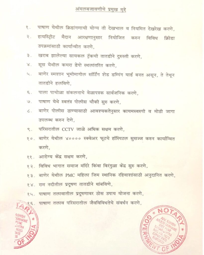 विशेषतः बालेवाडी, बाणेर, पाषाण व सुस परिसरातील वाहतूक समस्या, ड्रेनेज व पावसाळी पाणी साचण्याचे प्रश्न, स्मार्ट सिटी अंतर्गत रखडलेले प्रकल्प, मुळा नदी व पाषाण तलाव प्रदूषण, तसेच मूलभूत सोयी-सुविधांचा अभाव या मुद्द्यांवर टप्प्याटप्प्याने अंमलबजावणी करण्याचे आश्वासन देण्यात आले आहे.