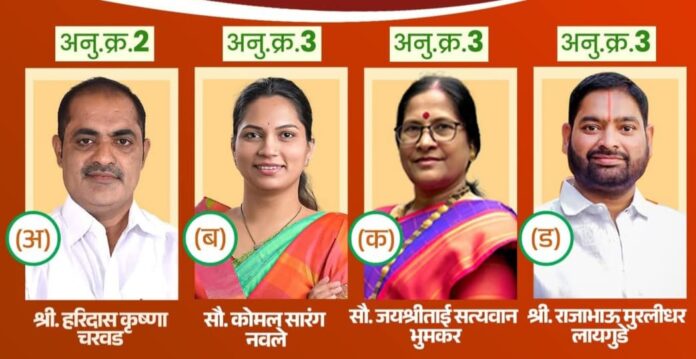 खडकवासलाः नऱ्हे, धायरी, वडगाव या प्रभाग क्रमांक 34 मध्ये भारतीय जनता पार्टीचे उमेदवारांचा मोठ्या फरकाने निवडून येत एकतर्फी विजय झाला आहे. हरिदास चरवड, कोमल नवले, जयश्री भूमकर, राजू लायगुडे हे भाजपचे उमेदवार निवडून आले आहेत.