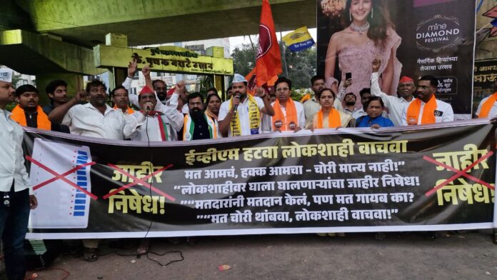 वारजे : प्रभाग क्रमांक 32 वारजे – पॉप्युलरनगरमधील सर्व पक्षीय उमेदवाराकडून मतदान प्रक्रिया आणि मतमोजणी प्रक्रिया यामध्ये झालेल्या छेडछाडी विरोधात वारजे चौक येथे ईव्हीएम हटाव लोकशाही बचाव घोषणा देऊन त्रिव स्वरूपाचे आंदोलन करण्यात आले.