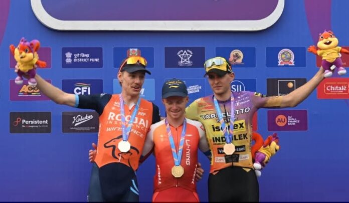पुणे : आमदार भीमराव तापकीर, मनपा आयुक्त नवलकिशोर राम यांच्या हस्ते विजेत्यांचा गौरव पुण्यात आयोजित ऐतिहासिक ‘बजाज पुणे ग्रँड टूर २०२६’ या आंतरराष्ट्रीय सायकलिंग स्पर्धेने दुसऱ्या दिवशी अधिकच थरारक वळण घेतले. ‘मराठा हेरिटेज सर्किट’ या दुसऱ्या टप्प्यात चीनच्या ‘ली निंग स्टार’ संघाचा सायकलपटू ल्यूक मडग्वे याने सलग दुसरा विजय मिळवत ‘यलो जर्सी’वरील आपले वर्चस्व कायम राखले. या वेळी आमदार भीमराव तापकीर आणि पुणे महानगरपालिकेचे आयुक्त नवलकिशोर राम आदी मान्यवरांच्या हस्ते यशस्वी सायकलपटूंचा गौरव करण्यात आला.