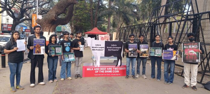 पुणे : प्रजासत्ताक दिनाच्या सप्ताहानिमित्त सुरू असलेल्या देशव्यापी मोहिमेचा भाग म्हणून, पुण्यातील तरुणांनी भारतातील दूध उत्पादन आणि बीफ निर्यात उद्योगातील परस्परसंबंधांवर लक्ष वेधले. पुणे ॲनिमल लिबरेशन या तरुण-नेतृत्वाखालील प्राणीहक्क संघटनेच्या वतीने जे.एम. रोडवरील संभाजी उद्यानात माहितीवर आधारित आणि प्रभावी दृश्य प्रदर्शन सादर करण्यात आले.