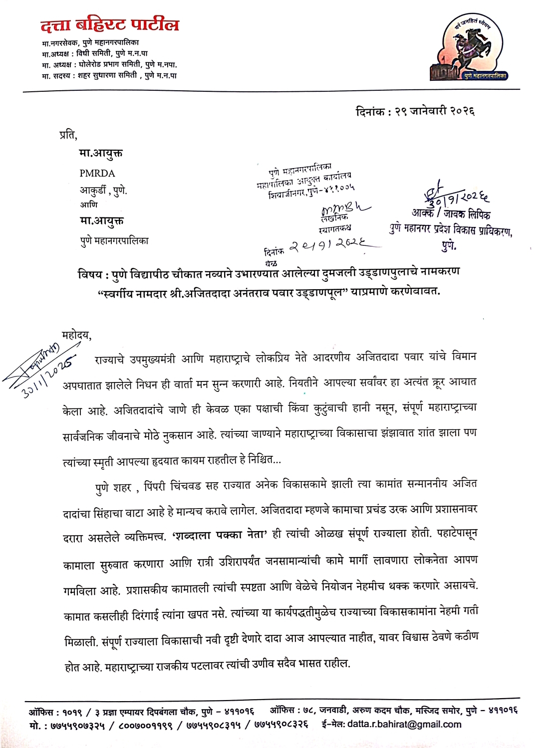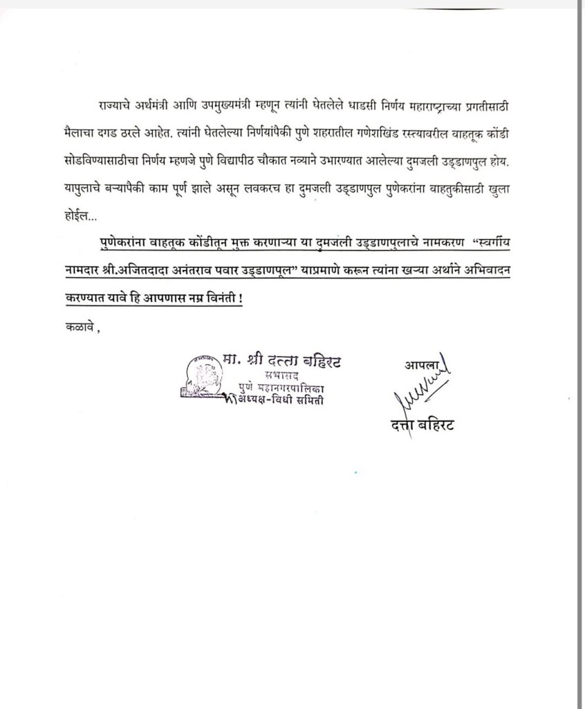 पुणेकरांना वाहतूक कोंडीतून मुक्त करणाऱ्या या महत्त्वाच्या दुमजली उड्डाणपुलास “स्वर्गीय नामदार श्री. अजितदादा अनंतराव पवार उड्डाणपूल” असे नामकरण करण्यात यावे, अशी मागणी दत्ता बहिरट यांनी PMRDA व पुणे महानगरपालिकेच्या आयुक्तांकडे निवेदनाद्वारे केली आहे.