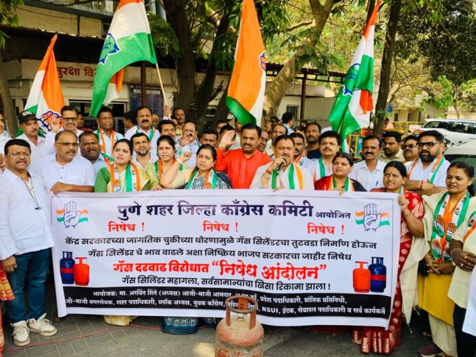पुणे : शासनाने घरगुती गॅस सिलेंडरच्या दरामध्ये अचानक फार मोठी वाढ केली तसेच गॅस सिलेंडरच्या नोंदणीचा कालावधी सुध्दा वाढविला आहे. याचा विपरीत परिणाम राज्यातील प्रत्येक कुटूंबावर होणार आहे. अच्छे दिनाचे स्वप्न दाखविणाऱ्या शासनाने मोठ्या प्रमाणात गॅस दरवाढ करून जनतेचा विश्र्वासघात केला आहे. या विरूध्द आज पुणे शहर जिल्हा काँग्रेस कमिटीच्या वतीने शहराध्यक्ष अरविंद शिंदे यांच्या नेतृत्वाखाली शासनाच्या विरोधात आंदोलन करण्यात आहे.