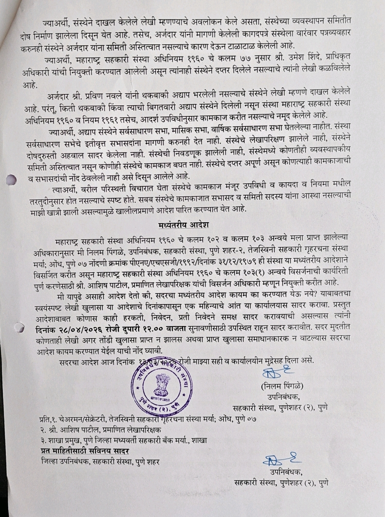 पुणे, प्रतिनिधी: महाराष्ट्र शासनाच्या सहकार विभागांतर्गत उपनिबंधक, सहकारी संस्था पुणे शहर (२) कार्यालयाने औंध येथील तेजस्विनी सहकारी गृहनिर्माण संस्था मर्या. विरोधात गंभीर अनियमितता आढळल्याने अंतिम आदेश जारी केला आहे.