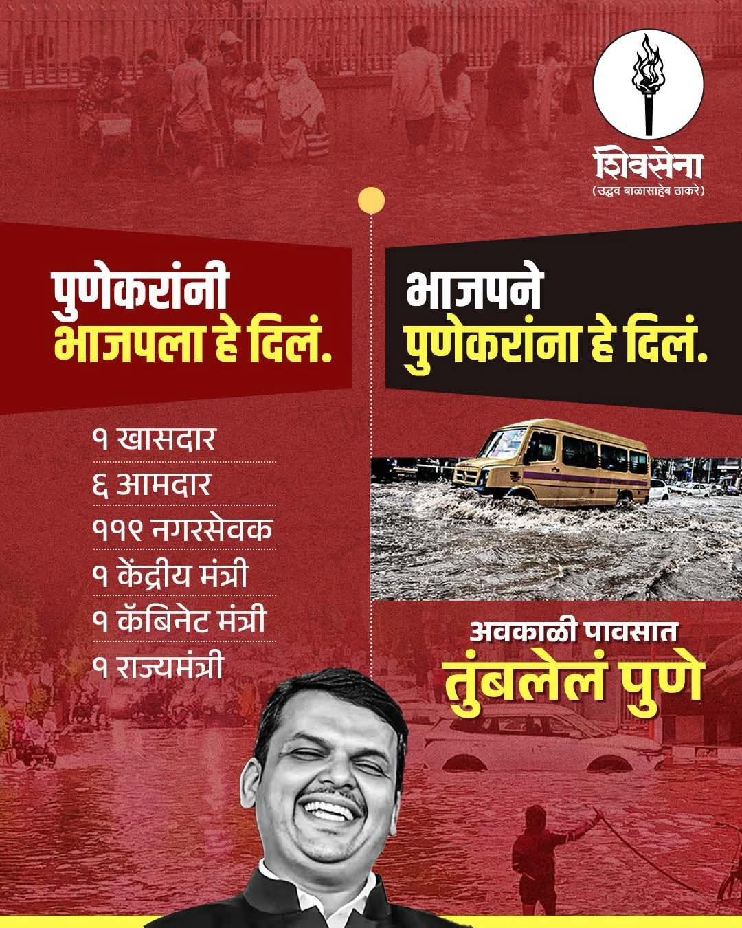 शिवसेना उबाठा ने म्हटले की, पुणेकरांनी भाजपला मोठ्या प्रमाणात राजकीय पाठबळ दिले आहे. शहरातून एक खासदार, सहा आमदार, तब्बल ११९ नगरसेवक, तसेच केंद्र आणि राज्यात मंत्रिपदे दिली. मात्र, या सर्व सत्तेच्या जोरावरही पुणेकरांच्या मूलभूत प्रश्नांकडे दुर्लक्ष होत असल्याचा आरोप करण्यात आला आहे.
