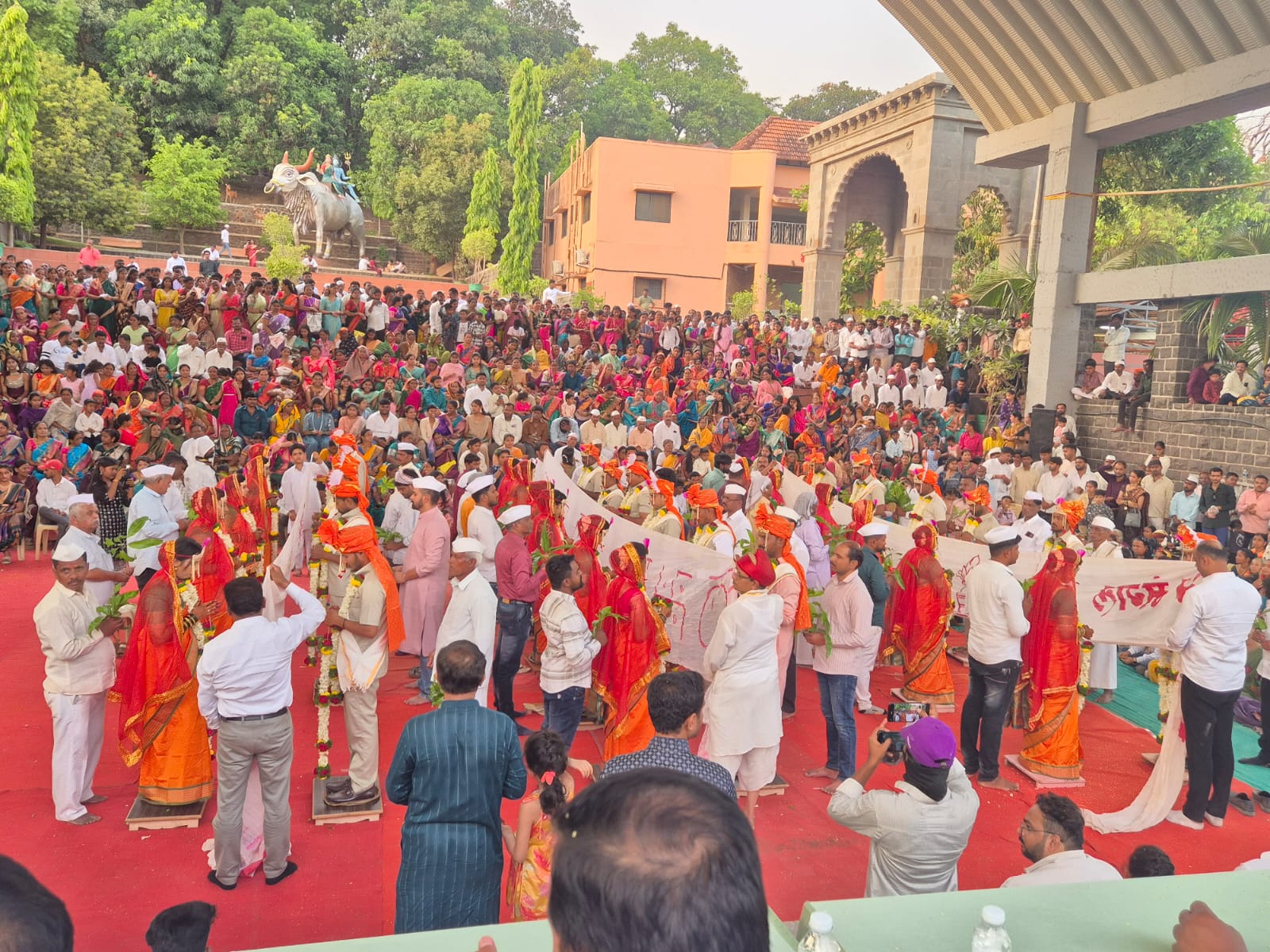 पिरंगुट : मुळशी तालुक्यातील निसर्ग सौंदर्याने नटलेल्या व महाराष्ट्रात प्रसिद्ध असलेल्या श्री म्हसोबा देवस्थानच्या प्रांगणात गेली 21 वर्ष अव्याहतपणे सुरू असणारा बिगर हुंडा मोफत सामुदायिक विवाह सोहळा रविवार दिनांक 12 एप्रिल रोजी श्री म्हसोबा देवस्थान खारवडे या ठिकाणी सायंकाळी साडेसहा वाजता गोरज मुहूर्तावर  संपन्न झाला.