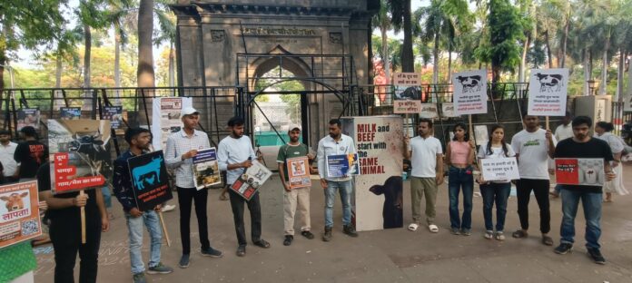 पुणे : भारतातील दूध व्यावसाय हा बीफ (गोमांस) निर्यातीला थेट बळ देतो, हे सांगत पुण्यातील तरुणाई आज रस्त्यावर उतरली. ‘पृथ्वी दिना’चे औचित्य साधून प्राणी हक्क कार्यकर्ते आज रस्त्यावर उतरले. अन् जगातील सर्वात मोठ्या दूध उत्पादक व्यवस्थेचे वास्तव नांगरिकां समोर मांडले. त्यांनी पुण्यातील जंगली महाराज रस्त्यावरील संभाजी उद्यानासमोर चित्रप्रदर्शन आणि निदर्शना द्वारे जनजागृती केली.