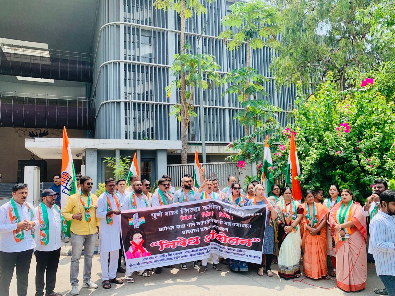 पुणे : महाराष्ट्र प्रदेश काँग्रेस कमिटीच्या आदेशानुसार, छत्रपती शिवाजी महाराज यांच्याबद्दल अत्यंत चुकीचे वक्तव्य करणाऱ्या धिरेंद्र शास्त्री ऊर्फ बागेश्वर बाबा याचा निषेध करण्यासाठी आणि त्यांच्यावर कडक कारवाईच्या मागणीसाठी पुणे शहर जिल्हा काँग्रेस कमिटीच्या वतीने शहराध्यक्ष अरविंद शिंदे यांच्या नेतृत्वाखाली आज जिल्हाधिकारी कार्यालय येथे आंदोलन करण्यात आले आहे.